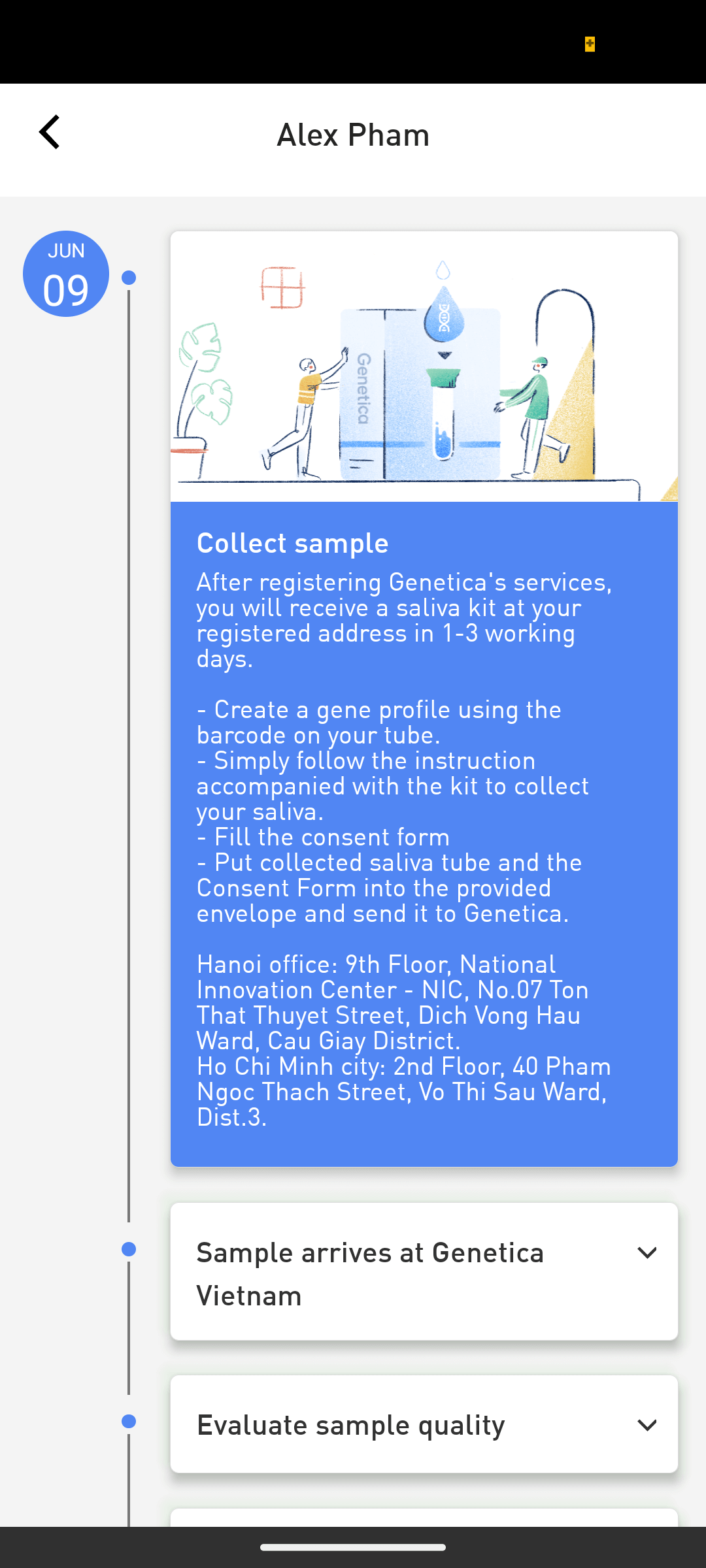 The mail carrier will come to collect within 2-4 working days. Genetica will update your genetic profile once we receive a valid form.